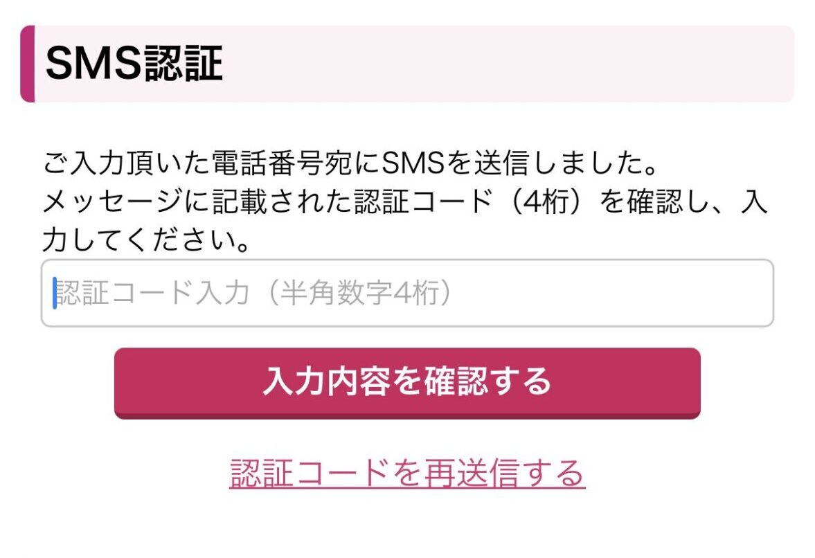 届いた認証コードを入力し、「入力内容を確認する」ボタンをタップしましょう。