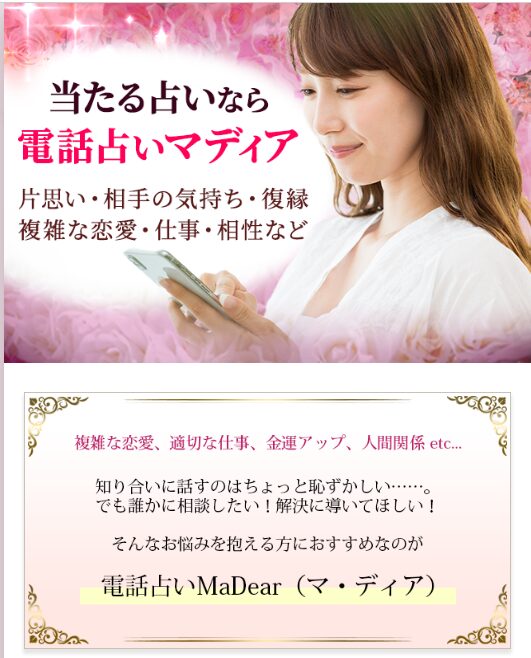 電話占いマディアは、電話占いマディアは、恋愛や復縁、結婚、不倫、人間関係など幅広い悩みに対応する人気の電話占いサービス。