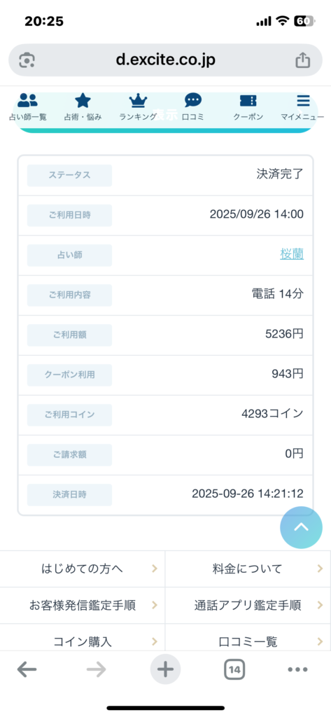 桜蘭先生の鑑定料(1分374円)だと、約14分間も無料で占ってもらえる計算です。