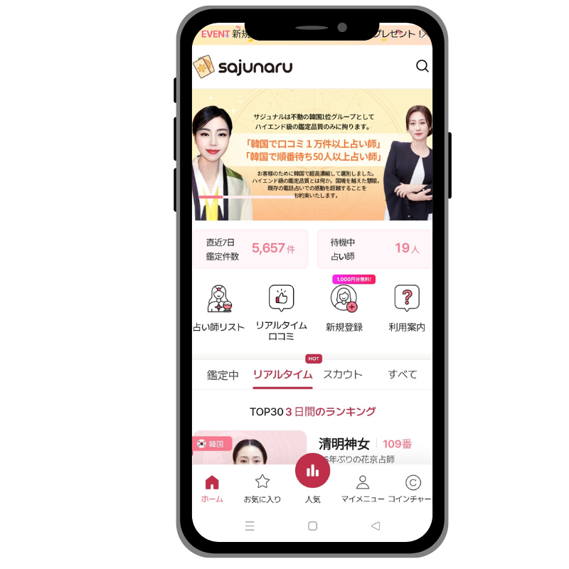 サジュナルは、韓国で売上No.1(2024年基準)を誇る超大型の占いサービスです。
