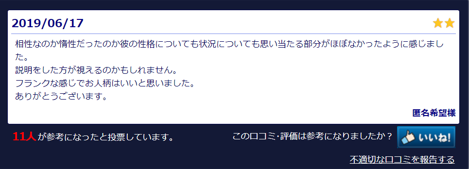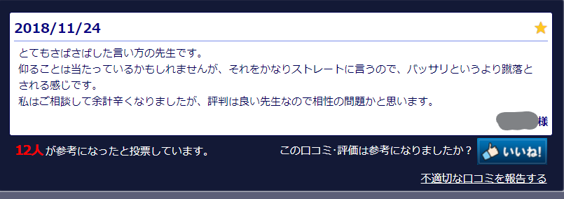 良くも悪くもハッキリと結果を伝えてくれる先生なので、真実を知りたい人にもおすすめですよ。